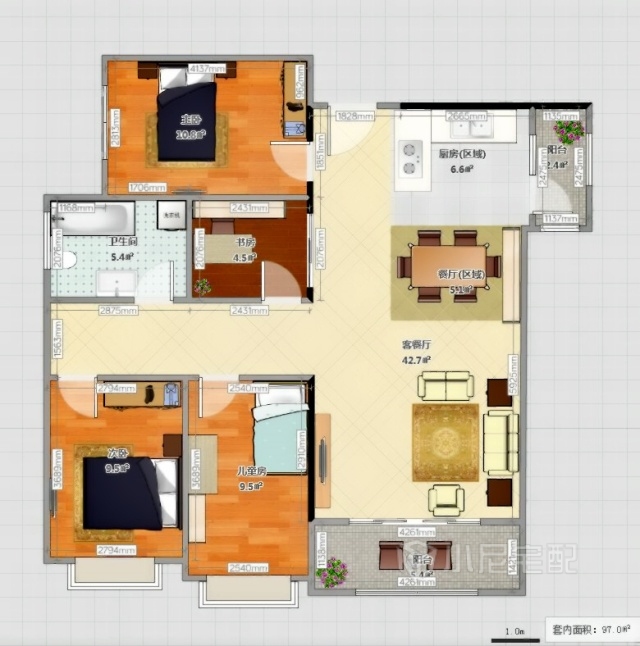 雖然面積不大,但是功能齊全、充分預(yù)留了兒童的活動空間。